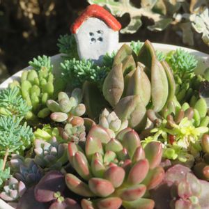 おはようございます😃 動きやすい気温で 庭仕事色々できます😄 多肉の寄せ植えがいくつかできました🎶 ポツンと一軒家 ピンクルビーがほんのり紅葉してきましたよ💕 地植えのセダムに子持ち蓮華が落ちて根付いたら、あら可愛くなりました💕 うさぎ🐇さん見守って〜😊