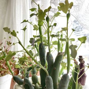 七宝樹(しっぽうじゅ)は南アフリカ原産のキク科セネシオ属の多肉植物です。 タワー状に伸びたきゅうりのような茎と先端に生えた三角矢の葉が特徴的な少し変わ...