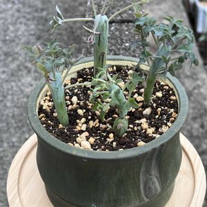 暖かな週末でせっせと植替え ぜんぜん時間が足りない😓 土曜日に、やぎさん家の多肉園が営業日だったので行ってきました🚗💨 たくさんお迎えしましたが、そのうちから…今日は七宝樹 実はありがたい事にいただいたものでして😅 3本はやぎさん家、1本はウチのです。 温存していた竹鉢にIN💕 なかなかいいじゃない😎