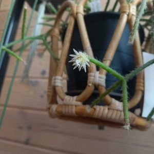 「リプサリス」 森林サボテンとも呼ばれる多肉植物 棘が全くなく細い紐状です 去年の11月にとても大きく成長したリプサリスを頂きました🎁 名前を聞いたことも見たこともない 私にとって初めての植物です 紐状に真っ直ぐ伸びたり そこから大きく枝分かれしてフワッと広がったり 不思議で未知の植物 長く大きく成長していて 我が家には吊るす場所がなく とても勿体なかったけれど株分けと✂️した部分は別の鉢に挿しました 冬の植替えは心配だったけれど 今のところみんな元気です🌿 1ヶ月前から先端に薄緑の小さな膨らみが見え始め… これは何だろう?と思っていたら 時間をかけて少しづつ白い蕾となり 5ミリ程の小さな花が咲き始めました 豆電球💡のような小さな花がたくさん付いて シャンデリア✨のような今のリプサリス くださった方の想いを引き継いで 大切に育てていきたいと思っています