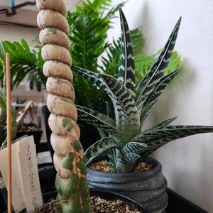 今日も最高気温36℃の猛暑日🥵 というか、週間予報見ると向こう1週間35℃越えが続く予想😇 休みの昨日は、ちょっと大きな亀甲竜をゲットしに行きました🪴 そして、あまり見かけない耐寒性の強いビスピノーサム。 更に長らく気になっていた千代田錦。ワイルドとは真逆なエリート感がまたいい😁 別名タイガーアロエですが🐅 左から、 アフリカ亀甲竜、 パキポディウム ビスピノーサム、 アロエ 千代田錦。