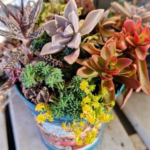 おはようございます😊 秋にリメ缶に寄せ植えた多肉植物。赤や黄色鮮やかです。 2枚めはチャッピー作の、編み物🧶ふう。 3枚め、今日のお花🏷️の金の成る木。公園の花友さんに貰って育てること3年。大きくなって、挿し木で株も増えました。花は咲かない😂。今年は夏場極力水やり控え、しっかり太陽に当てる。今年こそ花を咲かせるぞ‼️