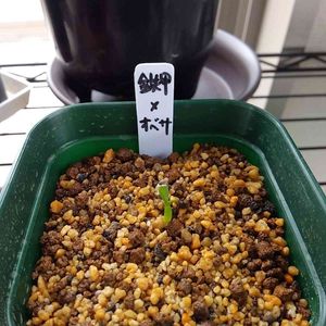5/8に一粒だけ種まきしていた 鉄甲丸オス×オベサメスの 交配で採れた種。 あとから追加で5粒採れてるが それはまだ発芽🌱していない。 成長が楽しみ😊