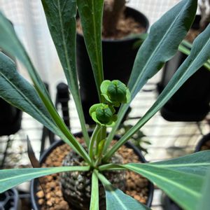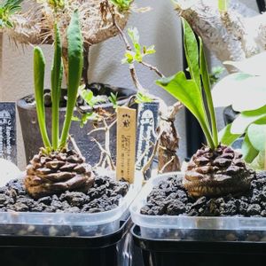 テレビで「パキポディウムエブレネウム、和名、恵比寿大黒…」って言っていたんだが、ホントに〜!!?😱 別の品種だと思っていたのだが、私がず〜っと間違えていたのか?😓 パキポディウムエブレネウムとは?って聞いてみたら AI「パキポディウムエブレネウム、和名、恵比寿大黒…」て言ってる〜😨 2枚目、こちらのエブレネウムは花芽がここまで成長。1枚目のに追いついて!🙏 交配したい! 3枚目〜オベサ鉄甲から子供を外す。 5つ🟢🟢🟢🟢🟢カキ仔😊 5枚目、親株スッキリ😊 ☁☁☁雨が降りそうで降らない