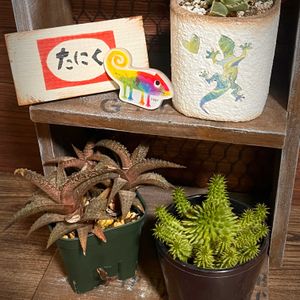🏷️I love はちゅ 🏷️コラージュして遊ぼ♡ で投稿させて頂きます🦎 ソックスアニマルちゃんを入れた 戸棚の部屋が 片付けの一時置き場になっているため 人形が出せません〜😂 なのでその他のグッズで 投稿させて頂きます😅 冷蔵庫に貼ってあるマグネット これはレオレオニのカメレオンだっけ? はちゅっぽい多肉 四海波は外の軒下で越冬 花が咲いたところは 残念ながら見落としました😂 ドラゴンボール(瑠璃晃)と 品種不明ハオルチア? は寒い室内で越冬中 ハオルチア?は茶色っぽい この色でいいのかしら プレステラのスリット2箇所から 新芽が出て来ています🌱 朝〜昼間は晴れていたのに 夕刻前から少し雨が降り始め 風が強まってきました 明日はまた☀️予報なので 一時的なことのようです