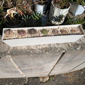 寄せ植えリトープスを植え替えしました 2つは腐れ神様の捧げ物に…😢 ①セリアで見つけた細長プランターに7つ! ②鉢が足りなかったから、同居してね ③「曲玉」っぽいこの子は、生育サイクルが違うかもしれないので別鉢 ④ちっちゃいこの子はマイクロ鉢へ ⑤ショック!植え替え直後にそばにいた母(視野欠損9割💦)に鉢をひっくり返された挙句踏まれてしまいました 生命力に掛けるしかない💦