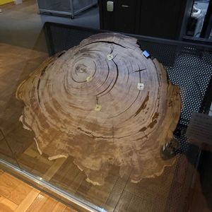 東大本郷博物館にて。 屋久スギ 屋久島には醤齢数千年といれわるスギが自生する。木には、過去の気候や太陽活動の変化による大気中の14C濃度の変動が刻み込まれている。この変動は、14Cの測定から実年代を正確に知ることを難しくしている。そこで、木の年輪を現在から過去まで数え上げ、年輪と年輪ごとの14C年代の対応を調べ、14Cの測定値から正確な暦年へ橋渡しする基準をつくる。