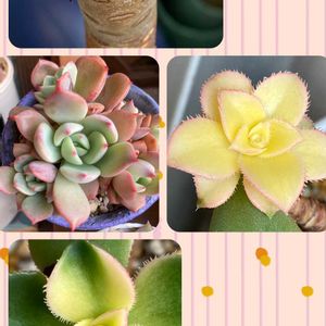 1枚目は紅葉がすっかりさめてる夕映えさん💚👀 2枚目はめちゃくちゃ紅葉中のミセバヤさん🩷👀 3.4枚目は可愛い子株ちゃんと葉挿しちゃん。マジックジャムゴールドさんだったかなぁ💛👀✨✨