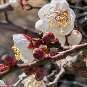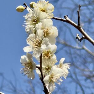 ウメ 昨日はお日柄もよく、用事を済ませた足で小さな公園に探梅に☀たくさんの梅の中から本日は白と淡いピンクの花梅と実梅をセレクトヽ(^o^)丿 ⦿月影:野梅系・青軸性 : スッキリと萼は緑💚♡ ⦿曙:野梅系・野梅性 : 小さなピンク🩷 ⦿白難波:野梅系・難波性 : 勢い良く八重に重なっている ⦿花香美:野梅系・野梅性:実梅 : 梅園の中でも一番香り豊かでした (人*´▽`)+・。* ⦿南高:野梅系・野梅性 : 実梅 : 梅干しといったらこれだな!