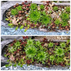 ①後ろの🩷は👵のサイデリア。こんなに立派に復活しました🙌。ヤッタネ ②てっきりセンペルだと思っていたけど、よくよく思い出すとツメレンゲだったかも?それとも両方混ざってるのかも🤔?…のミニ鉢、とにかく可愛くなってきた🎵 ③寄せ植えにした2年目のビデンス(右端)は新しい葉が出てるのに… ④こっちのローダンセマム2株は枯れ木?切りすぎたのかな? 綺麗な花を咲かせてくれたのに、もうあかんのかも😮💨と思いつつ、もう少しだけねばってみる。 ⑤気高き✨️クリローさん、まだ頑張ってます😊。 さて、これから本格☔️降り予報。降れ〜降れ〜たくさん🌧️!