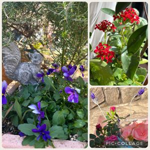 明るい日差しの今日の庭 ☘️ おまけ(右上)…室内で冬越ししてた昨年のカランコエが咲きました👏