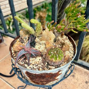 クラッスラ属 ベンケイソウ科 ゴーラム 別名宇宙の木🚀 金のなる木の枝分かれ品種です 多肉の詰め合わせの中に 窮屈そうに居たのは3年前🤔 毎年毎年頑張って今は7号鉢 ポロっとしてもすぐ根付くの🤭 渋めの金山焼鉢が板に付き まぁまぁ貫禄出て来た君に 今年の締めくくりを頼みます☺️ 🍀皆さま🍀 今年もお付き合い頂き ありがとうございました😊 どうぞ良い年をお迎え下さい🐴 やられた🤦♀️ 知らないうちに 🦛チョビ髭描かれてた〜