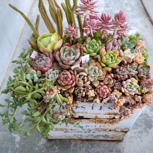 可愛い多肉が買えたので寄せ植えをしてみました🎶 全てホームセンターのものです 真ん中のエケベリアが、特にお気に入り 葉の先が黒っぽくなっているのが、ポイントです✨️ ムスコーサはひょろっと長くて面白いですよね~ サクサグラレモスグリーンというセダムは落ち着いたカラーで、寄せ植えの雰囲気がグッと良くなりました🥰