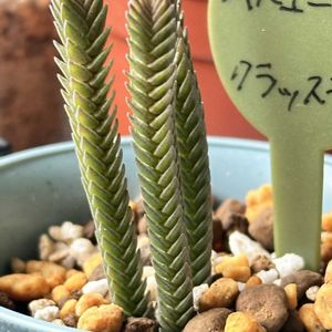 なんということでしょう 真っ直ぐに立っています 緑色の棒があああ クラッスラ属 ムスコーサ(青鎖竜) 小さな葉が鎖のように連なり、蛇のような独特の形状をして直立するそうです しかし変わった形状してますね