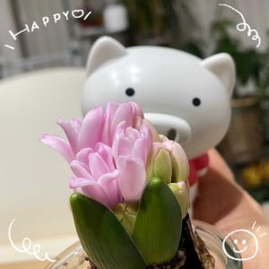おはようございます😃 今日も皆さまにhappy〜💕 ヒヤシンスの花芽が出てきました♬今年は優しいピンク色🩷 うれちーブヒヒ🐽いい香りもします♬根っこはそうめんみたい🤭 ④〜職場の金のなる木♬満開です😍
