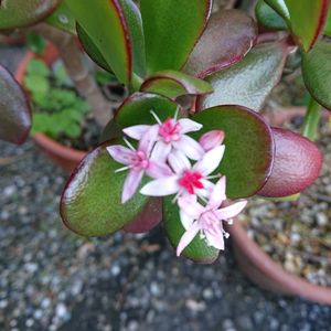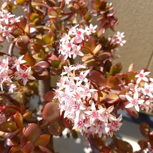 金のなる木 満開です🌸 株がかなり大きくなってます🌳 冬の間だけ玄関に入れるのですが、重いので大変💦 動かす度に枝が折れるので、必然的に挿し木になってます😅 根付いた株は身近な人に強制的にお裾分けしてますw