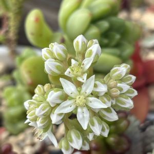 多肉植物の寄せ植え🍀 ベビーサンローズの花が咲きました💮 何日もかけて、淡いオレンジの蕾から黄色、白と変化していく様子も不思議で面白い♪ 昨年末に寄せ植えした子たち🍀 ちょっと手直ししたけど、宅配ボックスの上で寒い冬も乗り越えて…多肉たちって健気だなぁ😆 そんな姿に癒されてます😊
