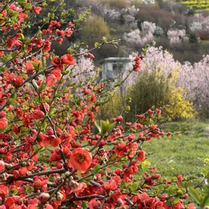 🌺 ボケ(木瓜) 🌺今日のお花 花見山公園内(福島市) 花見山公園にも春の訪れ〜 早咲きの河津桜も咲き始めましたボケはチラホラだったので昨年のボケをご覧下さいネ🌺 ❶〜❹ボケ✿ 昨年撮影📸 ❺生け花の里 一昨日撮影📸 河津桜は7分咲き〜3部咲き✿˳༚༅༚ ミモザ🌼も咲き始め〜 斜面に咲く雪割草が美しい〜 遠方に見える吾妻小富士の雪うさぎ🐇 ◉一昨年に作成した花見山の『みどりのまとめ』もご覧いただけたら嬉しいです☺️ ◉交通規制3/28 (土)〜4/19(日)07時〜17時 花見山公園には🚌移動になります