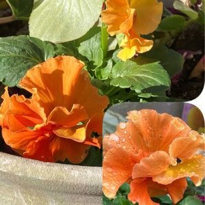 おはようございます😃 私の庭にて❣️ ①ビオラ🧡 フリフリが可愛いくて、ホームセンにて,税込78円で書いました☺️ 右下、雨の☔後に撮りました😆 ②ガーデンシクラメン 昨日、やっと花びらが…😄 ③サルメントーサ 緑から赤く紅葉して、蕾も出来てきました😊 ④皇帝ダリア 昨日の朝、花がひとつだけ咲いてるのを🤳パチリ😆 ⑤寄せ植え 春に地植えにした松を引っこ抜いてきて、花木センターで買ってきたビオラとハボタン(今回は白い🤍方にしました)家🏠にあったセンリヨウ、トラデスカンチアを入れて植えて見ました🤗 このセンリヨウには、ちょっとした仕掛けが…🤭フフフ 🏷️土曜日はお空の発表会 🏷️土曜日は紫の花 🏷️2のつく日は斑入りの日 🏷️斑入りの見つけ隊♪No.23 🏷️青空っ子 🏷️0の付く日は雨粒の日 参加します。
