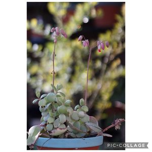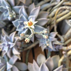 お花が咲き始めました。 1pic目:朧月🌕さんの一番花⭐️。他のたくさんのつぼみも成長してきました。 なお、親戚の白牡丹さん(朧月さんと他の多肉植物の掛け合わせ)は夏バテで体力を復活させるのに時間がかかったため、つぼみをつけるのが遅れてます。😥今やっとつぼみの先っぽが出てきました。 2pic目は、デンタータ・ラベンダー🪻ちゃんの先始めです。 小さなお花が集まっているみたいなので、1番花開花でいいかな🤔