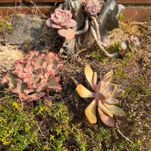 久しぶりに花壇多肉⸜🌷︎⸝ 斑入りタイトゴメがかわいくなってきました♡ pic.3 この姫秀麗より pic.4 こっちの姫秀麗のほうがすきです 何が違うかって写真じゃ分かりにくいけど色合いとかぷくぷくさとか葉っぱの感じとか、、 家族にも分からないって言われます😌😌 pic.5 淵からはみ多肉がいつの間にか地面まで届きました この時期は雨が降るたびに成長してますね👏🏻