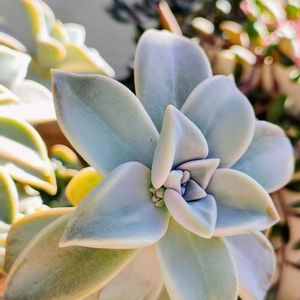 白い粉で覆われた葉を持つ多肉植物。群生して育つ。