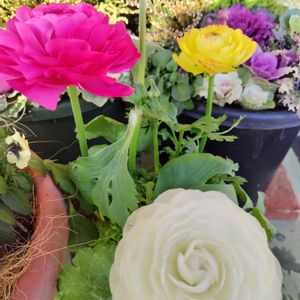 ラナンキュラスの寄せ植えが可愛いく咲いてます🩷🤍💛 振り続いた雪が凍り、屋根からぶら下がって、その先にツララが出来ています❄️⛄🥶💧 雪はそろそろ終りにして欲しいな…💦 おやつのスイートポテトを作りましたよ😍