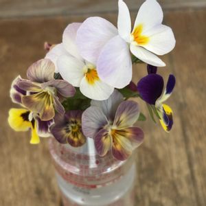 剪定のタイミングを逃し、雨で蒸れてしまったビオラ。 綺麗な花を摘んで、水挿し。 可愛い🤭🍀 姫秋麗も白雪ミセバヤも可愛いです🙆♀️