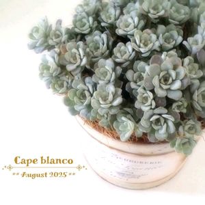 ケープブランコ(白雪ミセバヤ)の夏越し記録です。 ★写真1,2枚目 ケープブランコは夏に弱い種類として知られていますが… この鉢はかなり成績が良く、特に何をしたというわけでもないのに無事でした。 半日陰退避もさせておらず、家の南側で遮光をしていただけなのですが…。 ケープブランコ単独の鉢は他にも2つあり、それは置き場所が違ったのですが、そちらはダメになっていました。 この夏、自分ではあまり面倒を見ていないので、なんでこれだけがこんなに無事だったのかわからないのですが、推測するに 鉢が浅くて土が乾きやすかったのが一因かなと思います。 私が家に戻ってきた7月後半以降は2日に1回の水やり(表面だけさらっと濡らす程度)をしていました。 過去の様子は 🏷はなずきんケープブランコ で見られます。 ★写真3枚目 サキュレントアネモネさんの多肉弁当で作った寄せ植えの中のケープブランコも元気でした。 過去の様子は 🏷はなずきんアネモネ寄せ植え で見られます。 寄せ植えの中の種類は半分以上枯れてしまったのですが、ケープブランコは大丈夫でしたね。