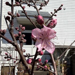 令和8年3月21日 桃(ひめまるこ) 第1花が咲きました。 糖度が高い桃なので楽しみ。今年は勇気を持って摘果します! できるかなぁ。