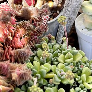 ぷっくりした肉厚で光沢のある葉と、季節に毎の色彩の変化が特徴的な多肉植物です。夏場は緑色ですが、秋〜
