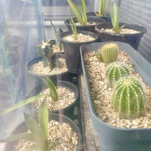 室内避難中の多肉さん達。 手前の22年選手のサボテン🌵さんは 外栽培でますます巨大化!