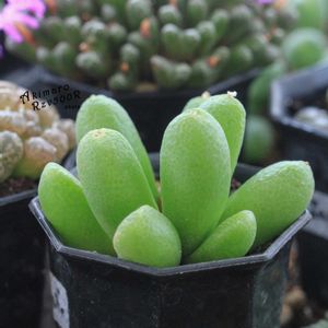 先端がくぼんでいる棒状の葉を持つ「宇宙の木」の愛称で呼ばれる多肉植物。
