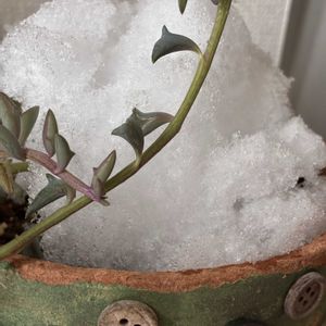 ドルフィン🐬& キラッキラもふもふの雪❄️✨ 今まで外のビニール温室に置いていた ドルフィンネックレス🐬 玄関に移動しました🪴 水でなく、雪を置いて❄️🤭 📸11:49 2️⃣外のラティスの上でパチリ📸 後ろはモッコク→間違えた!キンモクセイ🌳 📸11:42 3️⃣角度を変えると、背景はミモザ🌿 📸11:44 あとで枝が折れないように、雪をはらいます💪🏿😊 4️⃣玄関開けると❄️✨ 関東平野も、やっと お湿り です❄️ 📸12:05 5️⃣ここは次女が仕事の合間に立ち寄った【花田苑】 家からもとても近い場所で、四季折々 とっても素敵な場所です🌿❄️🌿 前pic 2022.5/4 🏷️キラ✨キラ 🏷️ネックレスの日 🏷️毎月8日は鉢の日 🏷️平和を願う🕊️