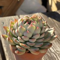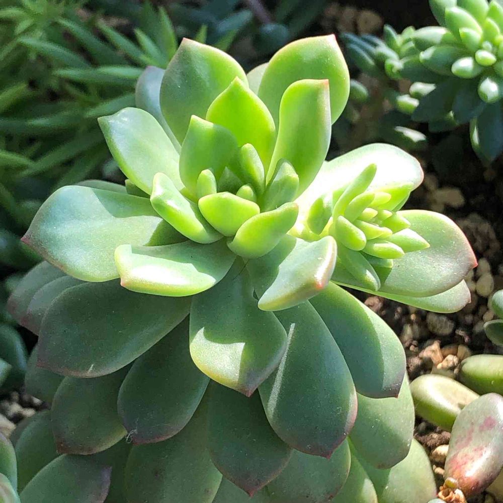 アエオニウムの中でもこの種は、強い光を浴びると葉が緑から紅桃色や紫色になります。ロゼットの大きさは1