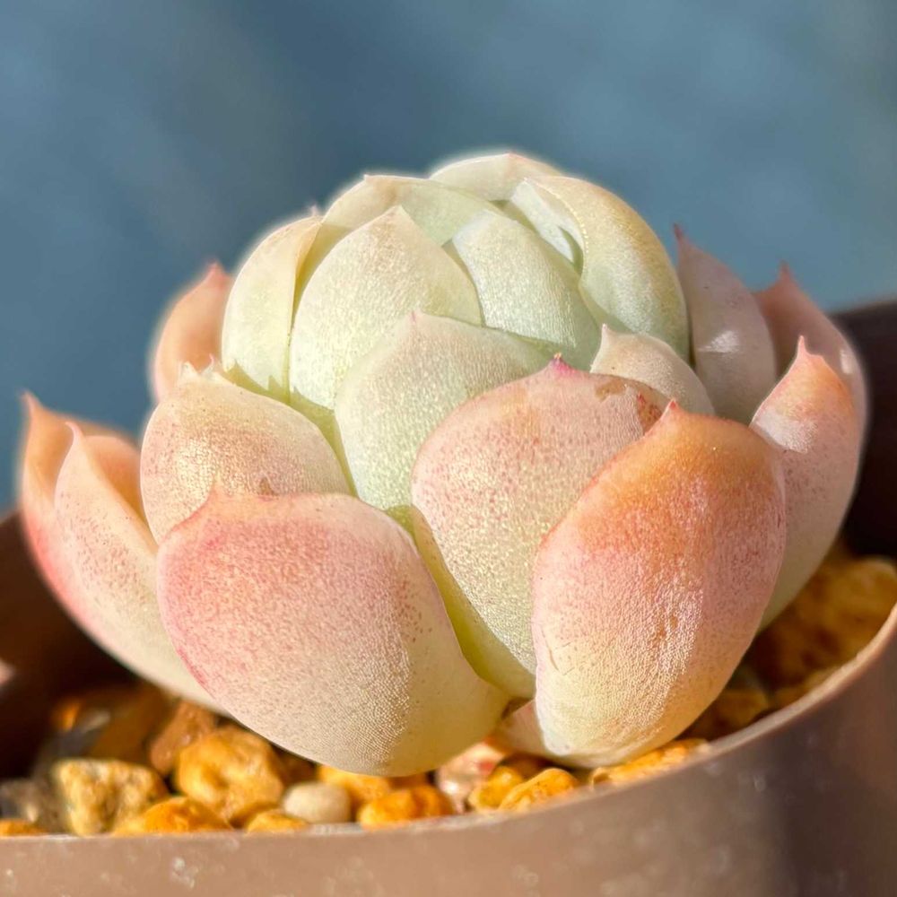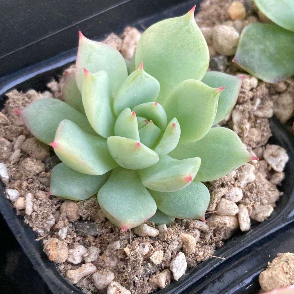 エケベリアの中でも観賞価値が高いといわれる美しい品種。ライトグリーンの葉先がピンク色に美しく染まりま