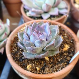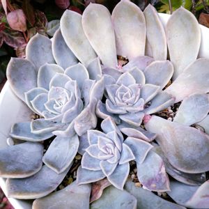 エケベリア「エボニー」 セネシオ「銀月」 ほとんどのエケベリアが夏にパッカーンして傷んで、冬に綺麗に整う 毎年の無限ループです😭 銀月はこのところ調子が良くて、脇芽もよく出てます🌱
