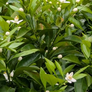 『健康美』『汚れなき人』。「健康美」は、ゆずの実にリラックス効果や美肌効果、むくみ予防などさまざまな効能があることに由来するといわれています。「汚れなき人」は、真っ白な美しい花姿に由来するといわれています。冬至にゆず湯に入るのは、運を呼び込む前に身を清める風習で、香りの強いゆずが邪気を避けると考えられていました。血行を促進して冷え性を緩和したり、体を温めて風邪を予防する効果もあります。花期は5~6月です。