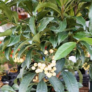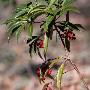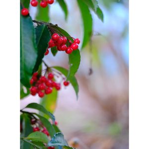 『寿ぎ』『財産』『金満家』『徳のある人』。「寿ぎ(ことほぎ)」「徳のある人」は、お正月の縁起物として飾られる赤い実にちなみます。「金満家」は、実が熟してもなかなか落ちない様子に由来するといわれています。花期は7~8月です。