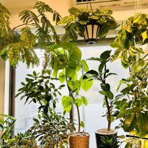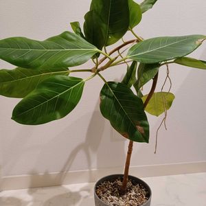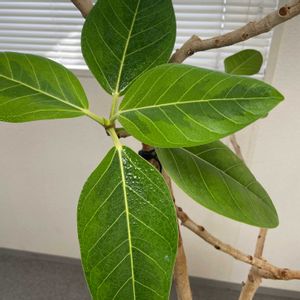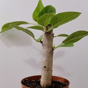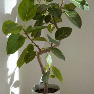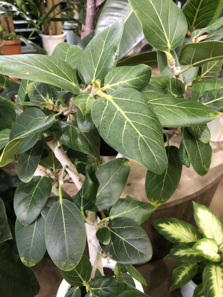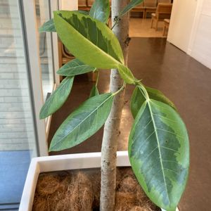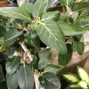 『永遠の幸せ』。丈夫で強い生命力を持っていることが由来とされています。明るい印象の黄色の斑が入った葉が特徴で、インテリアグリーンとして人気があります。ゴムの木の仲間です。