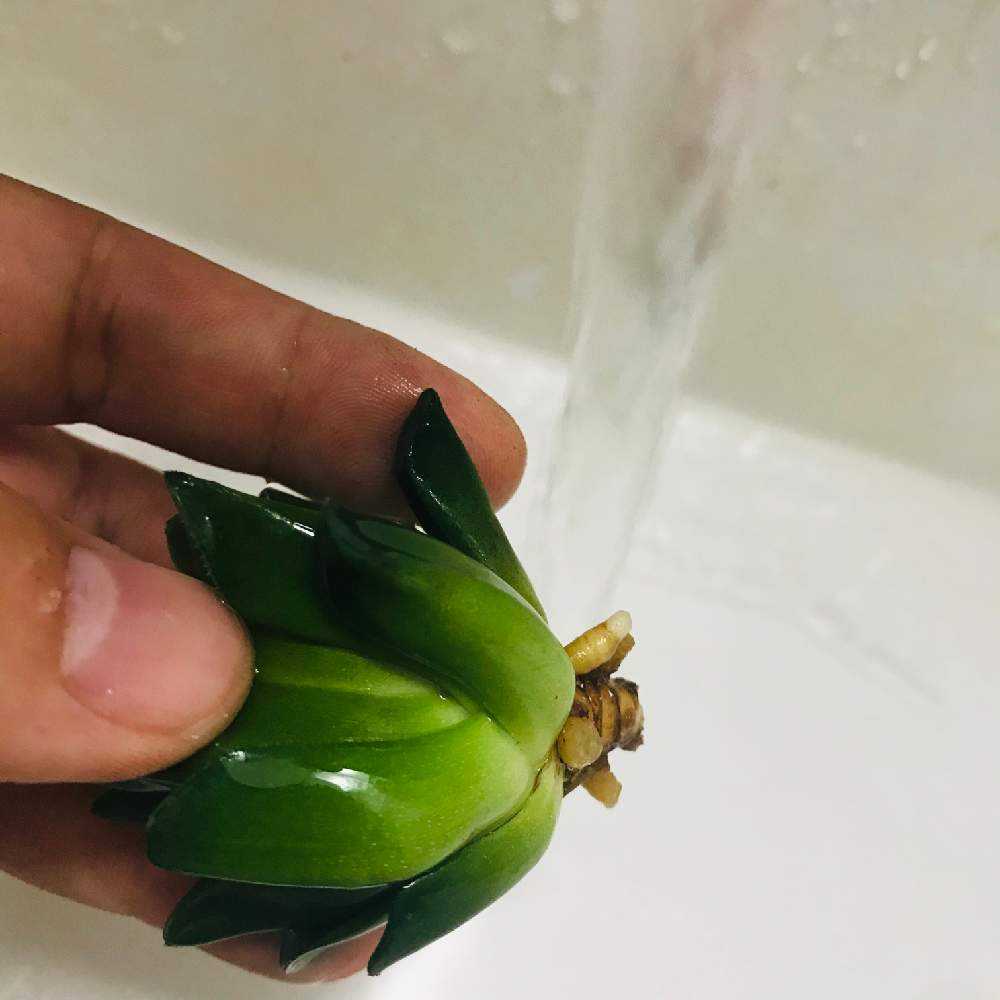 水耕栽培に備えるために、根っこを短く切って水洗い。長い根っこは土向けの根っこらしくて、水耕栽培する時は根っこを短くしてそれ用の根を生やしてもらわないと駄目らしい。