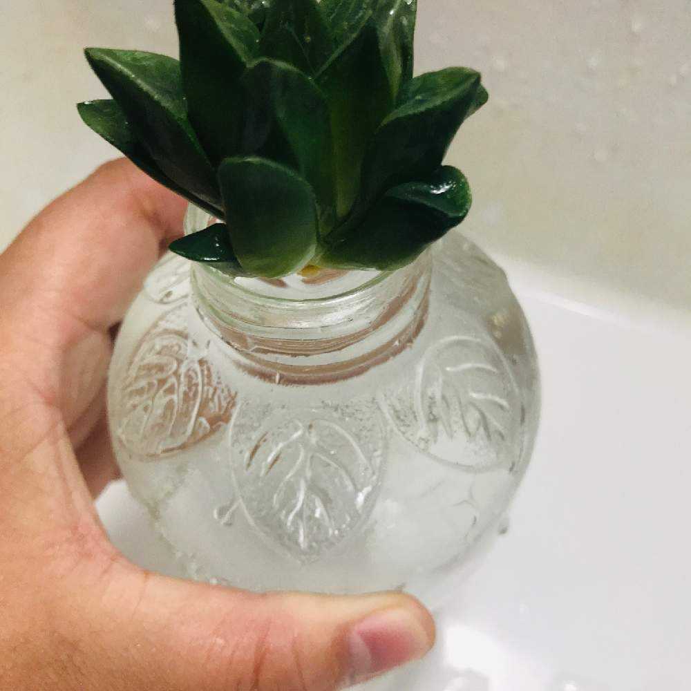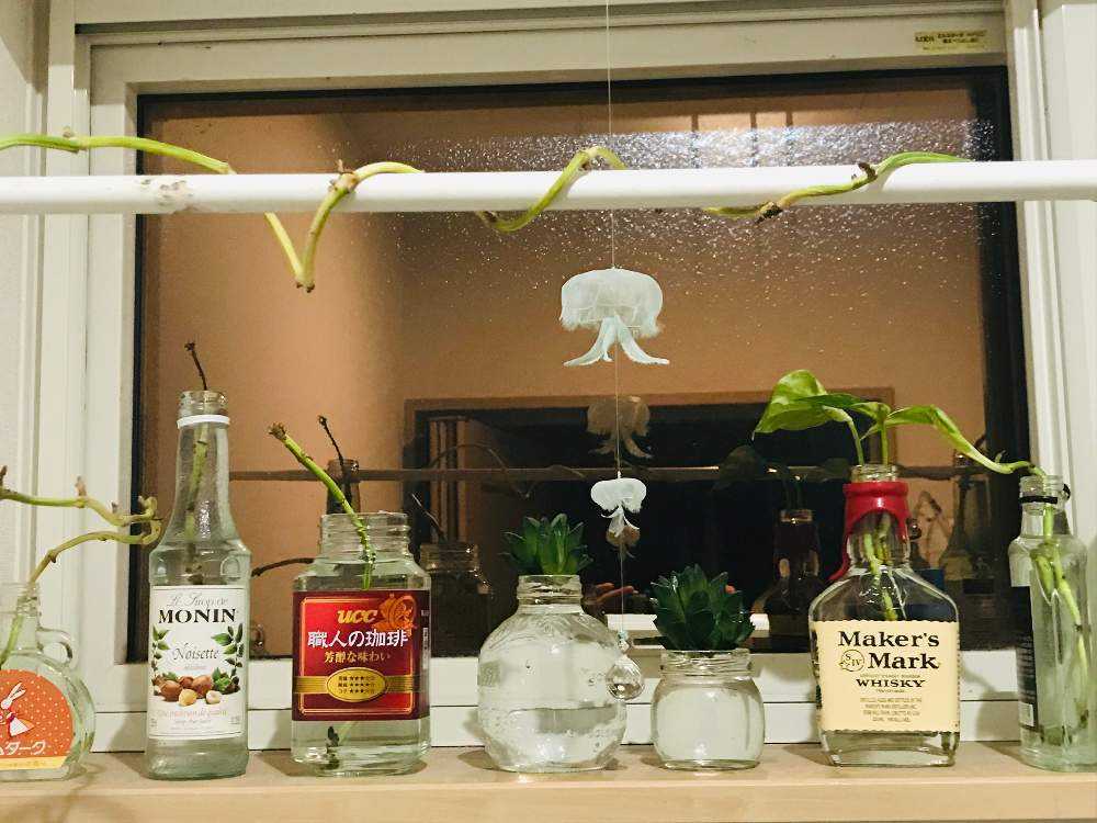 お気に入りのリンゴジュースの瓶を綺麗にして、水と根っこがギリギリ触れるくらいに水を入れてみました。小さい子は瓶の入り口小さいジュース系が落っこちなくていいですね。かわいい。