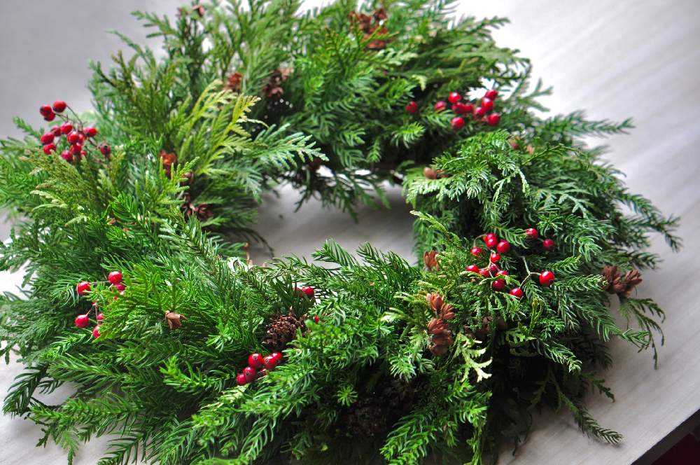 自然にドライになっていく過程も楽しみたいので、葉がパラパラと落ちにくいスギとヒバの2種類を混ぜて使いました。グリーン主体のリースは何種類かの葉があるとリースを仕上げた時に立体感が出ます。