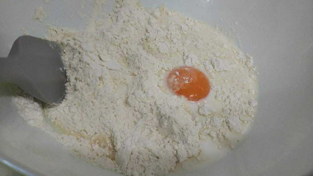 まず、ホットケーキ粉、卵、牛乳を