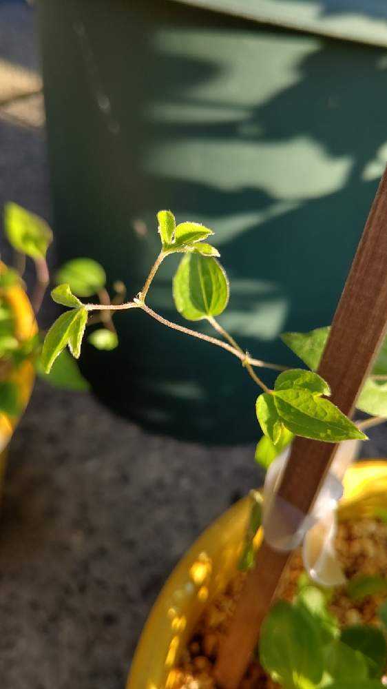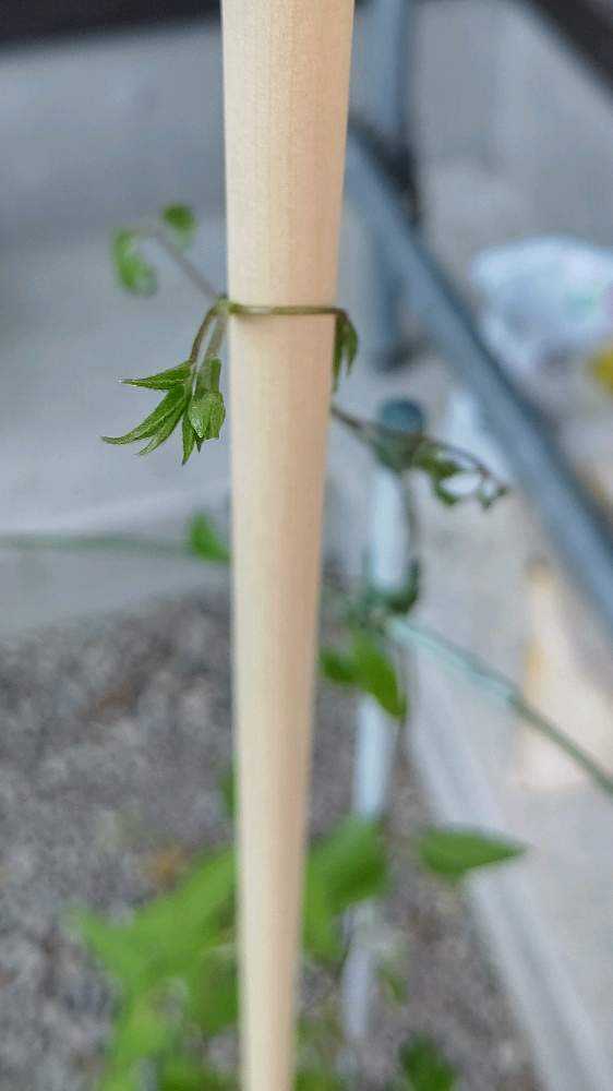 葉は少しだけ大きめなのが増えてきた。つる性なのになかなか支柱に絡まない。