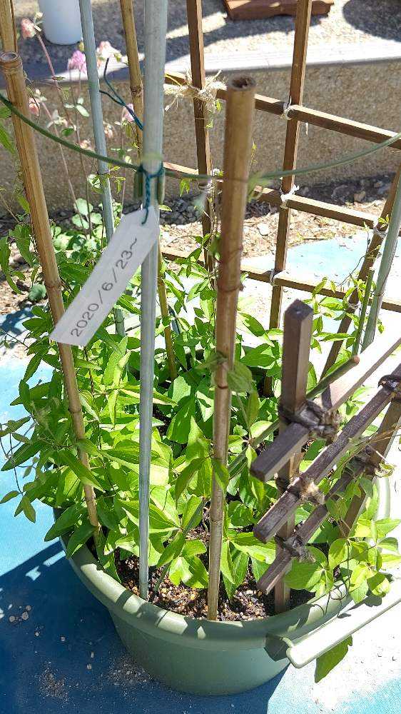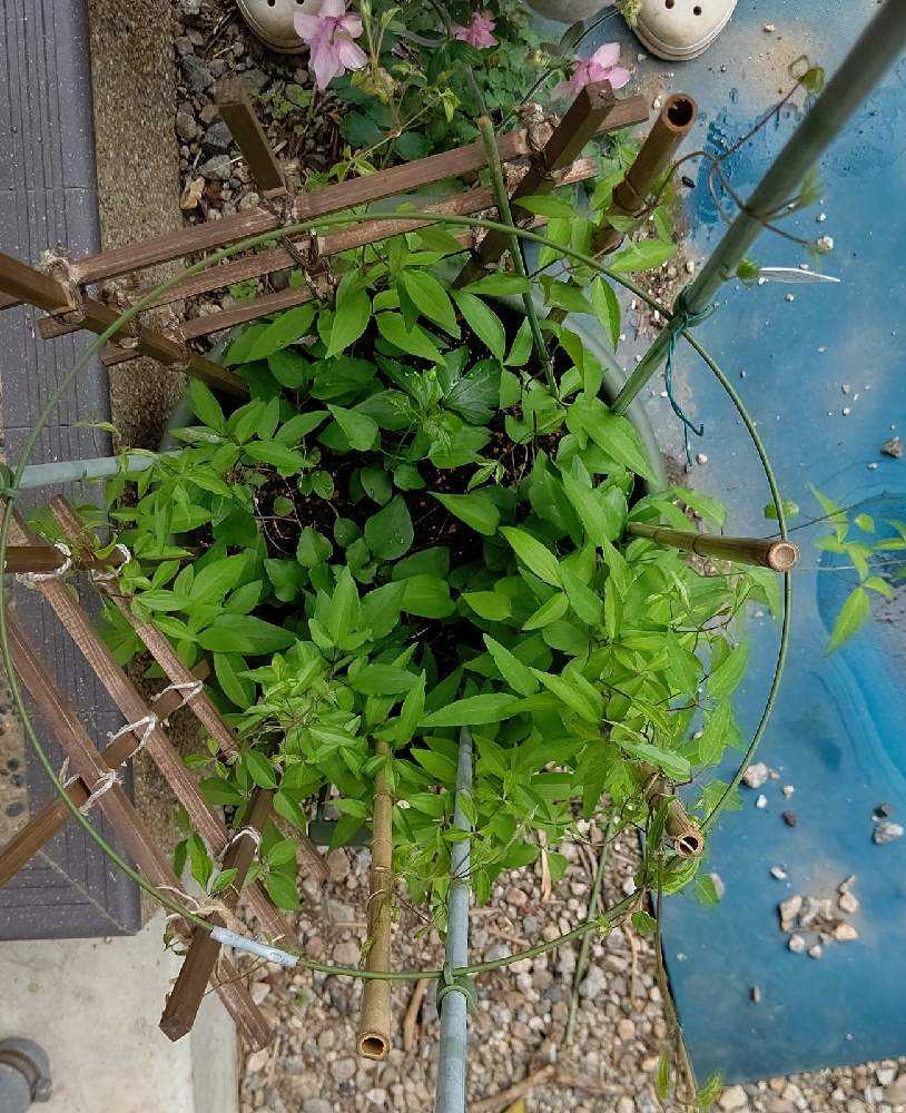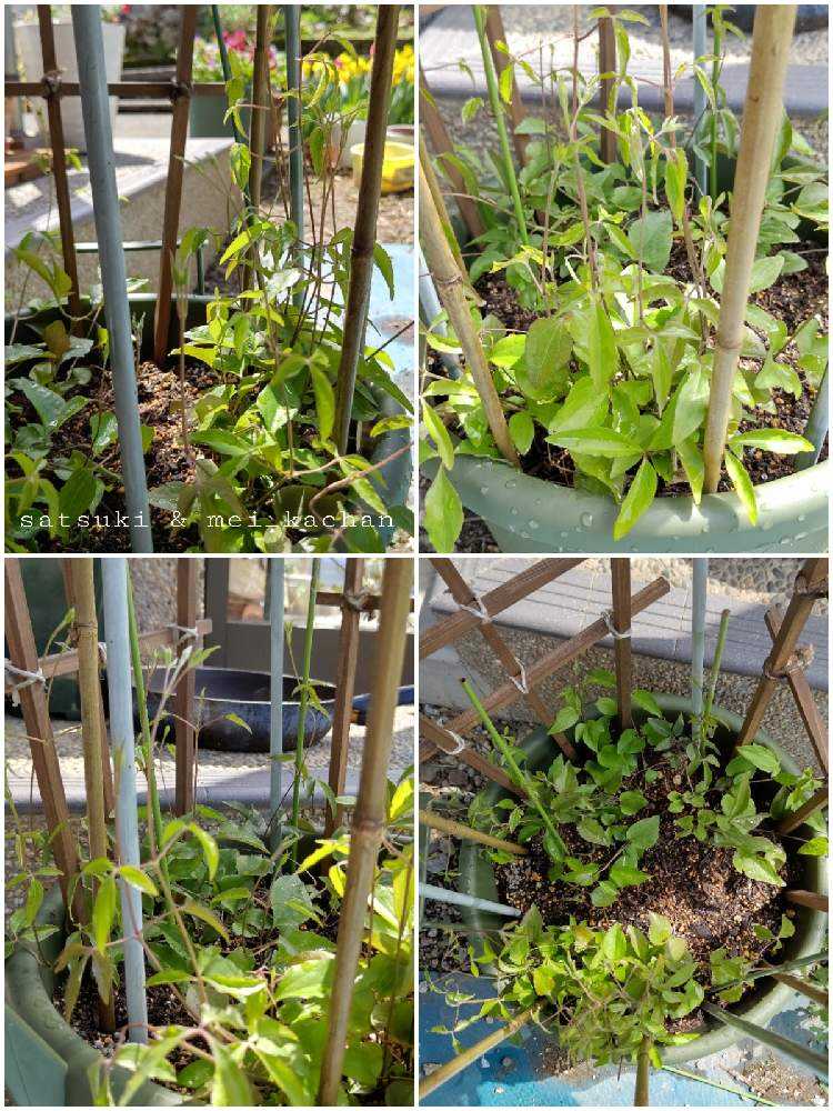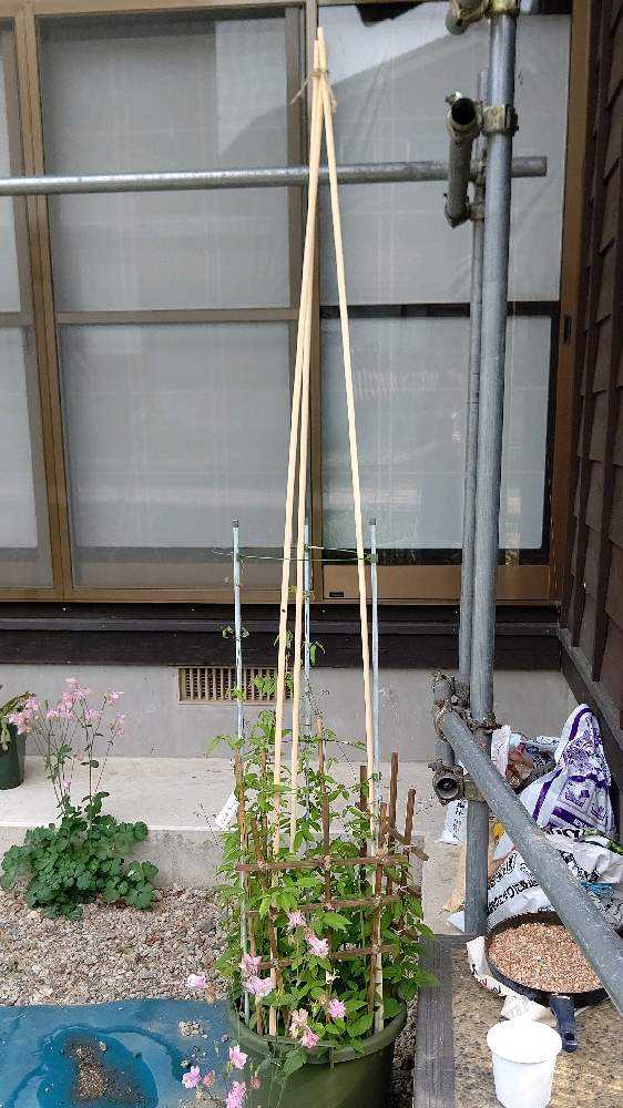 更に大きな鉢にまとめて、支柱を増やしました。