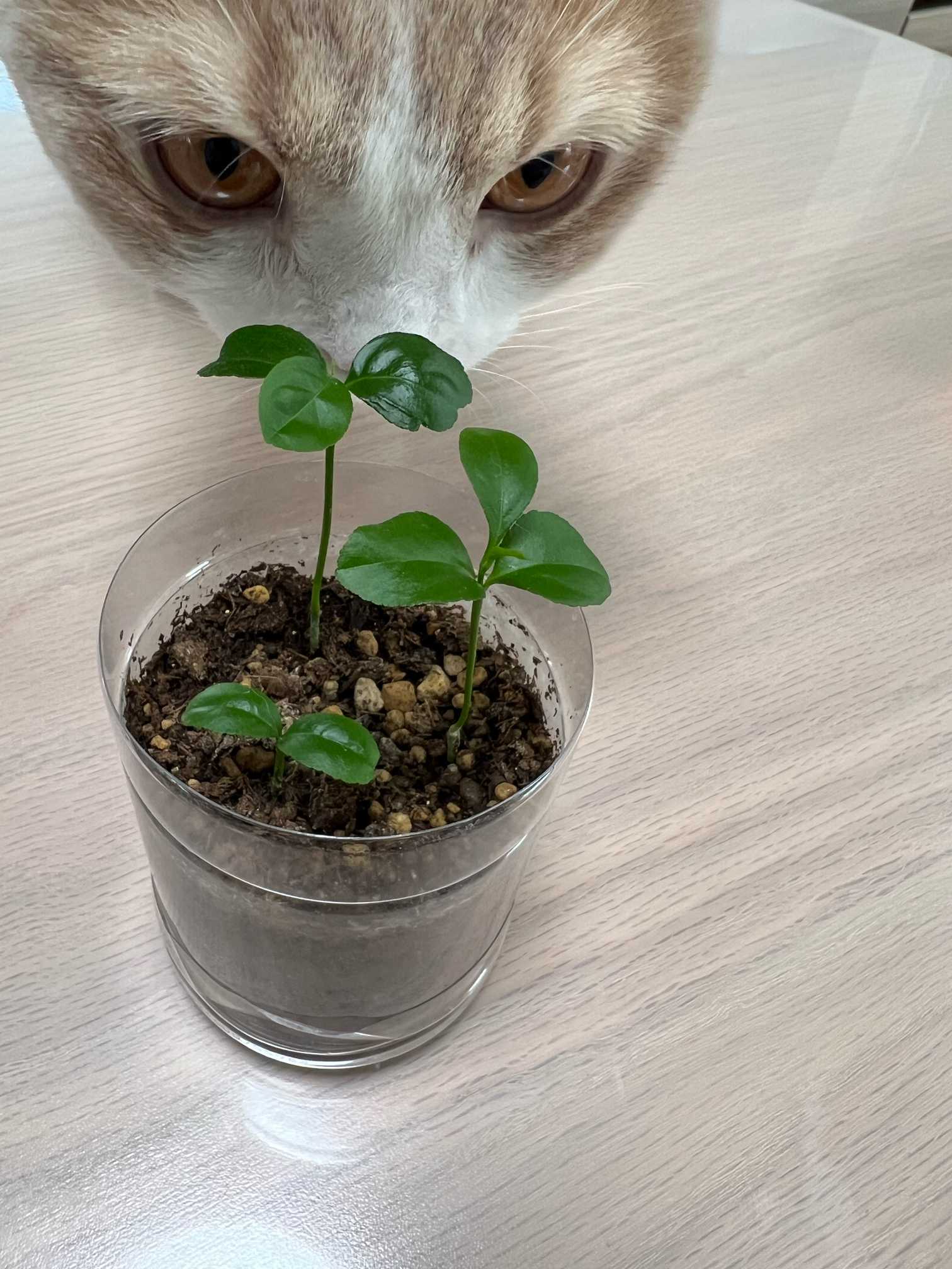 ペットボトルで簡易的な植木鉢を作り、発芽した種を、3粒播種。