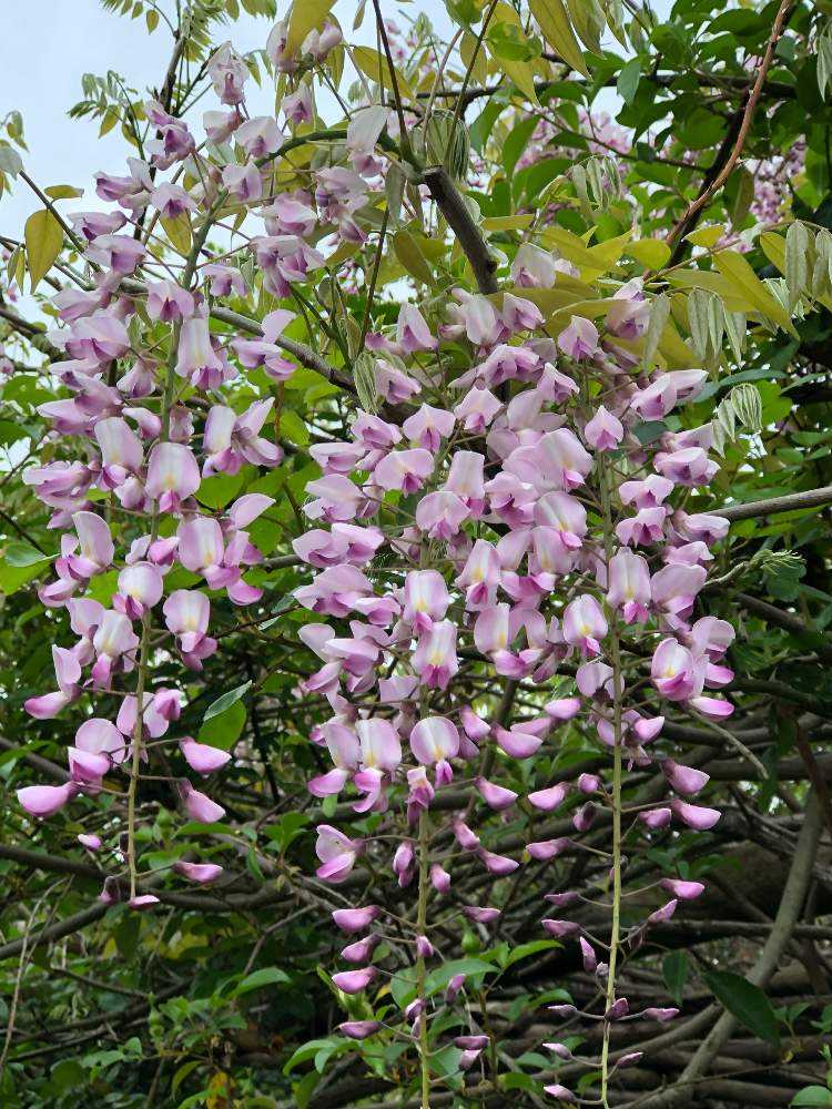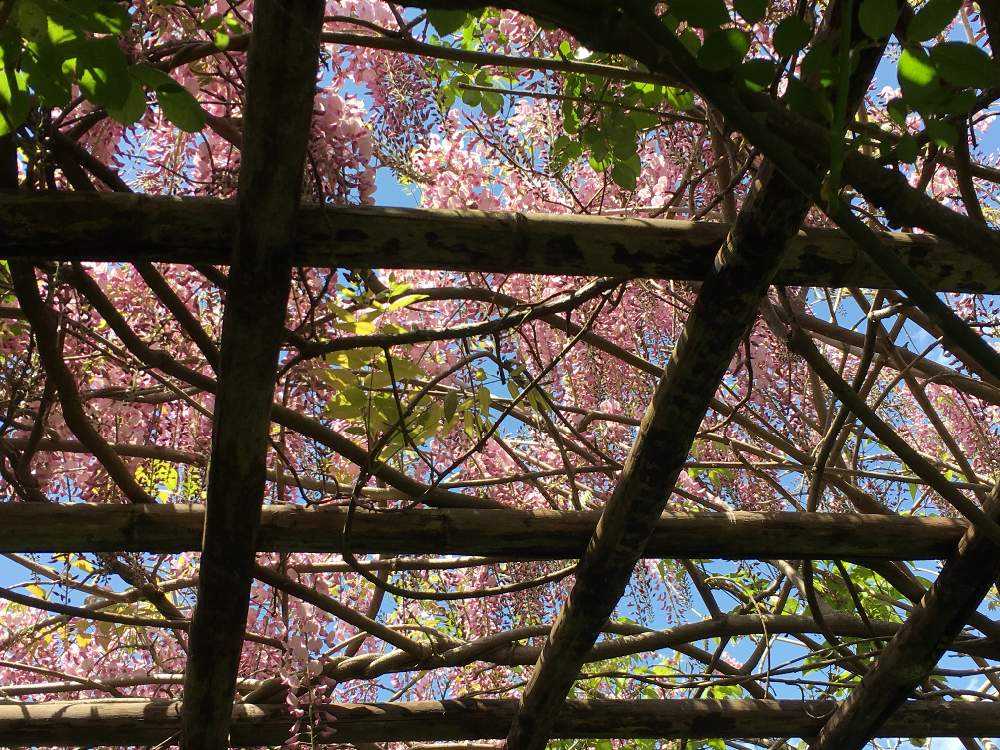 紅藤の棚を下から覗いたら、ピンクの空が、、、広がっていました