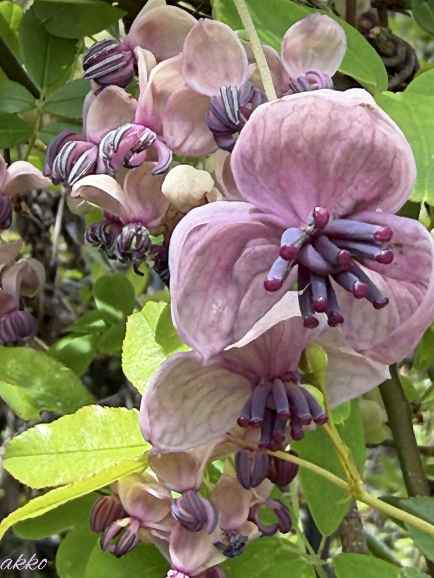 春先にあけびの花もツルが絡んで咲いてきました