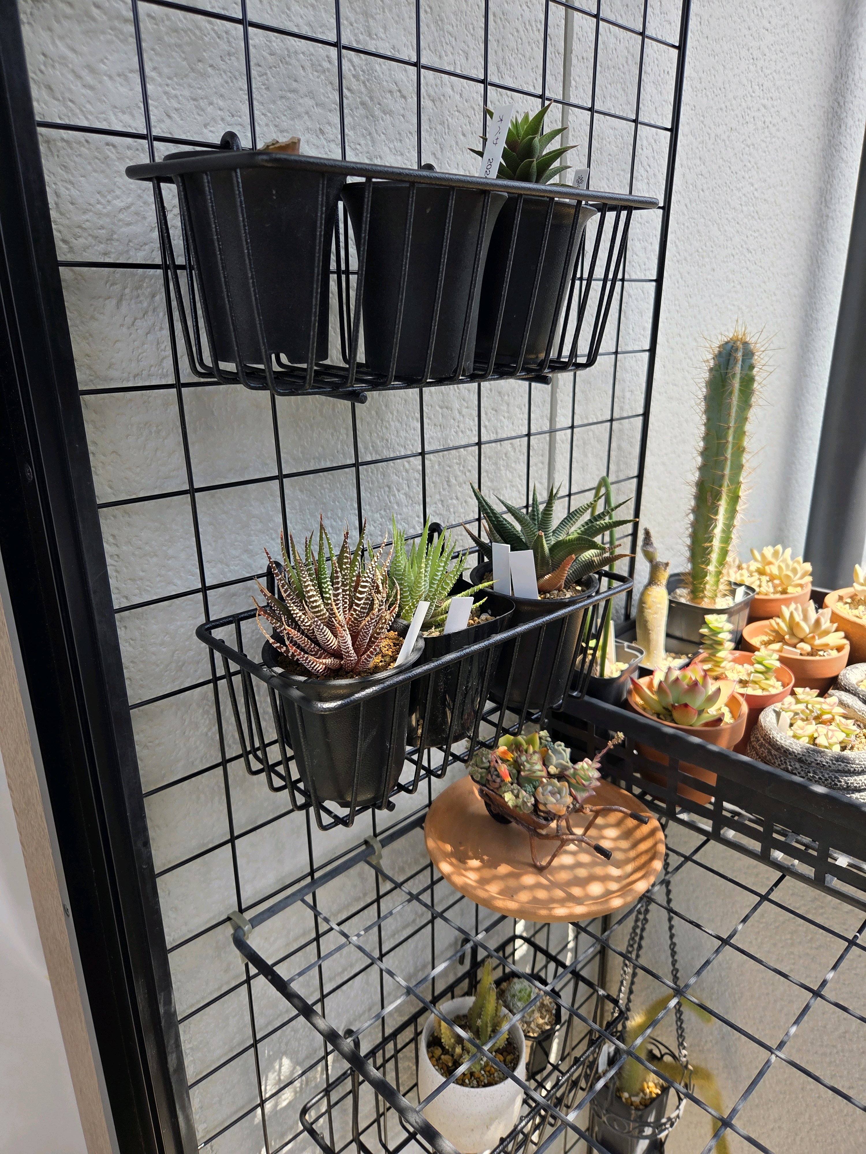 コーデックス師匠に頂いたこの黒いプラ鉢…屋上の格子にぴったりフィットすることが判明しました。鉢は倒れることはないし通気も良いのです。